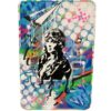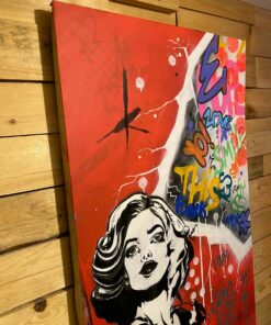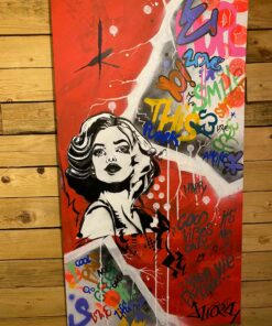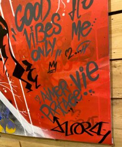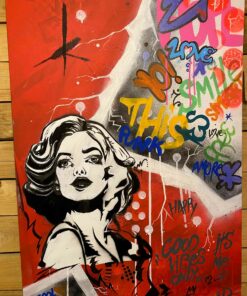 Cette œuvre vibrante mélange des éléments de pop art et de street art, créant une symphonie visuelle dynamique. Le visage d’une femme, dessiné en noir et blanc, se détache audacieusement sur un fond rouge vif. Son regard intense et ses traits stylisés captent immédiatement l’attention. Autour d’elle, des graffitis colorés s’étalent sur la toile, intégrant des mots et des phrases comme « Love » et « Good Vibes ». Ces inscriptions, dans des tons vifs de bleu, jaune et violet, apportent une énergie rebelle et optimiste à l’ensemble. Les lignes blanches et grises, formant des motifs géométriques, ajoutent de la profondeur et structurent la composition. L’œuvre incarne un message de positivité et de modernité, équilibrant parfaitement le chaos urbain avec une esthétique soignée.