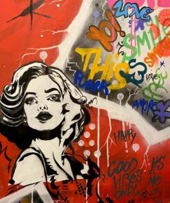 Cette œuvre vibrante mélange des éléments de pop art et de street art, créant une symphonie visuelle dynamique. Le visage d’une femme, dessiné en noir et blanc, se détache audacieusement sur un fond rouge vif. Son regard intense et ses traits stylisés captent immédiatement l’attention. Autour d’elle, des graffitis colorés s’étalent sur la toile, intégrant des mots et des phrases comme « Love » et « Good Vibes ». Ces inscriptions, dans des tons vifs de bleu, jaune et violet, apportent une énergie rebelle et optimiste à l’ensemble. Les lignes blanches et grises, formant des motifs géométriques, ajoutent de la profondeur et structurent la composition. L’œuvre incarne un message de positivité et de modernité, équilibrant parfaitement le chaos urbain avec une esthétique soignée.